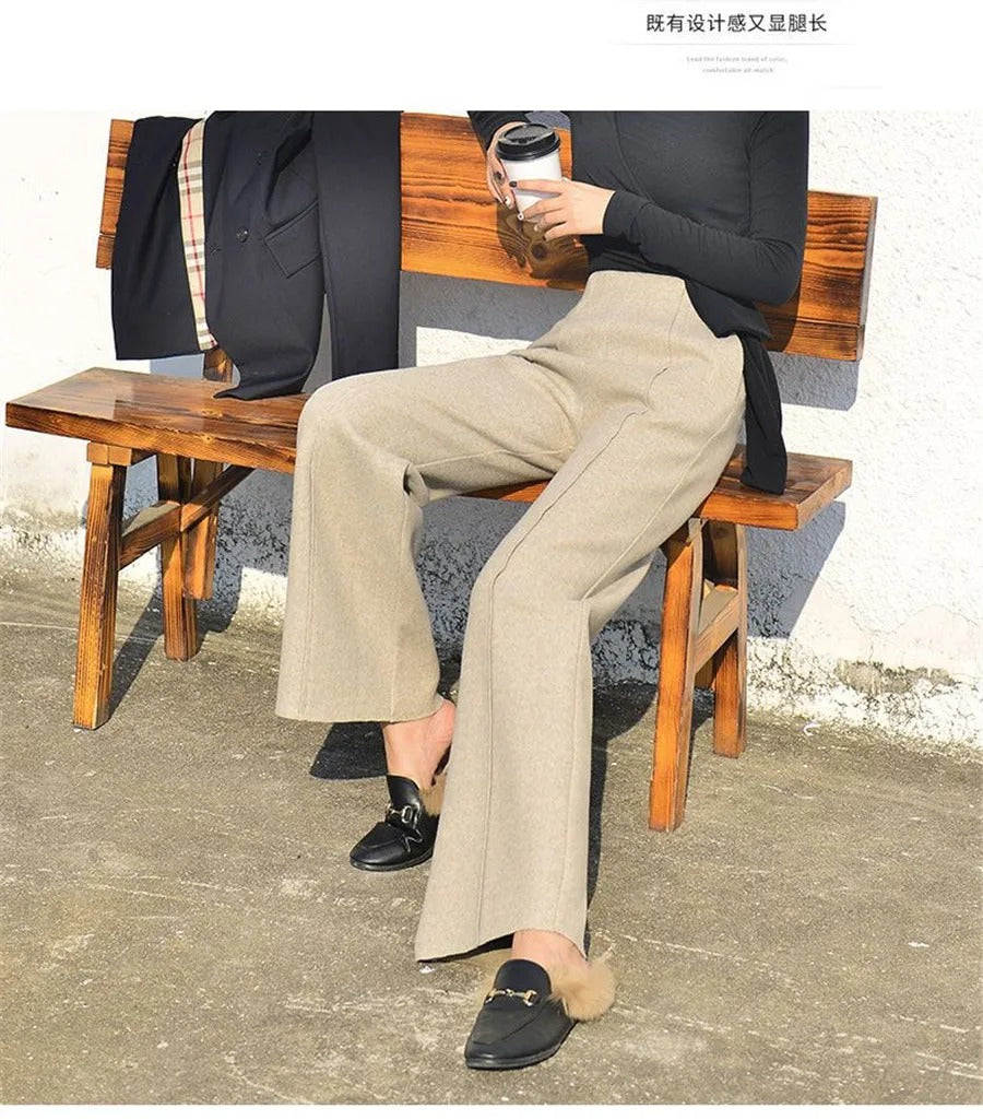 Das hochwertige Wollmischgewebe sorgt für angenehme Wärme, während der fließende Wide-Leg-Schnitt eine schmeichelnde, verlängerte Silhouette kreiert. Die hohe Taille betont sanft die Figur und formt eine klare, feminine Linie – ideal für stilvolle Alltagslooks, Büro-Outfits oder entspannte Winterspaziergänge.