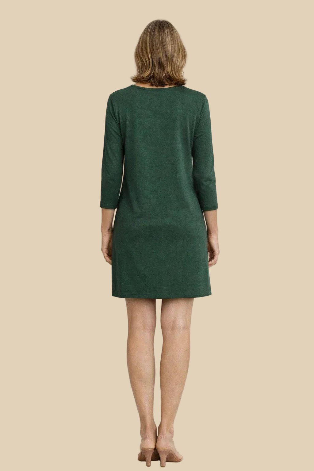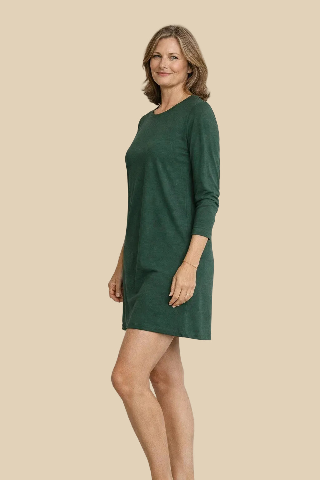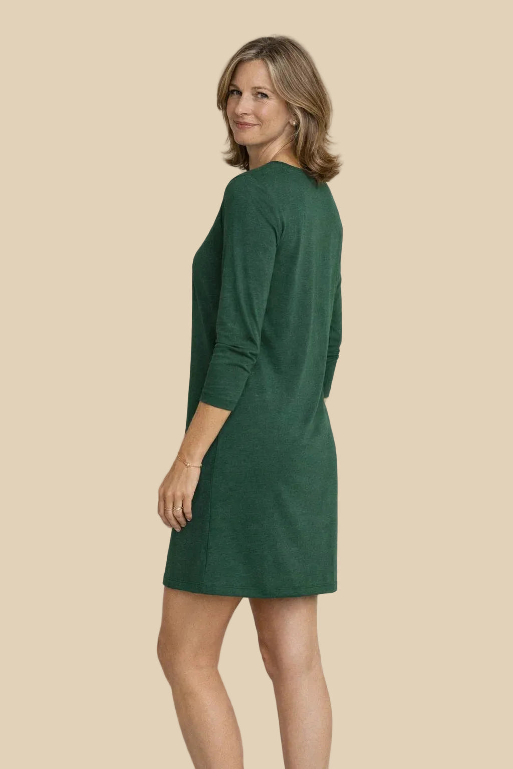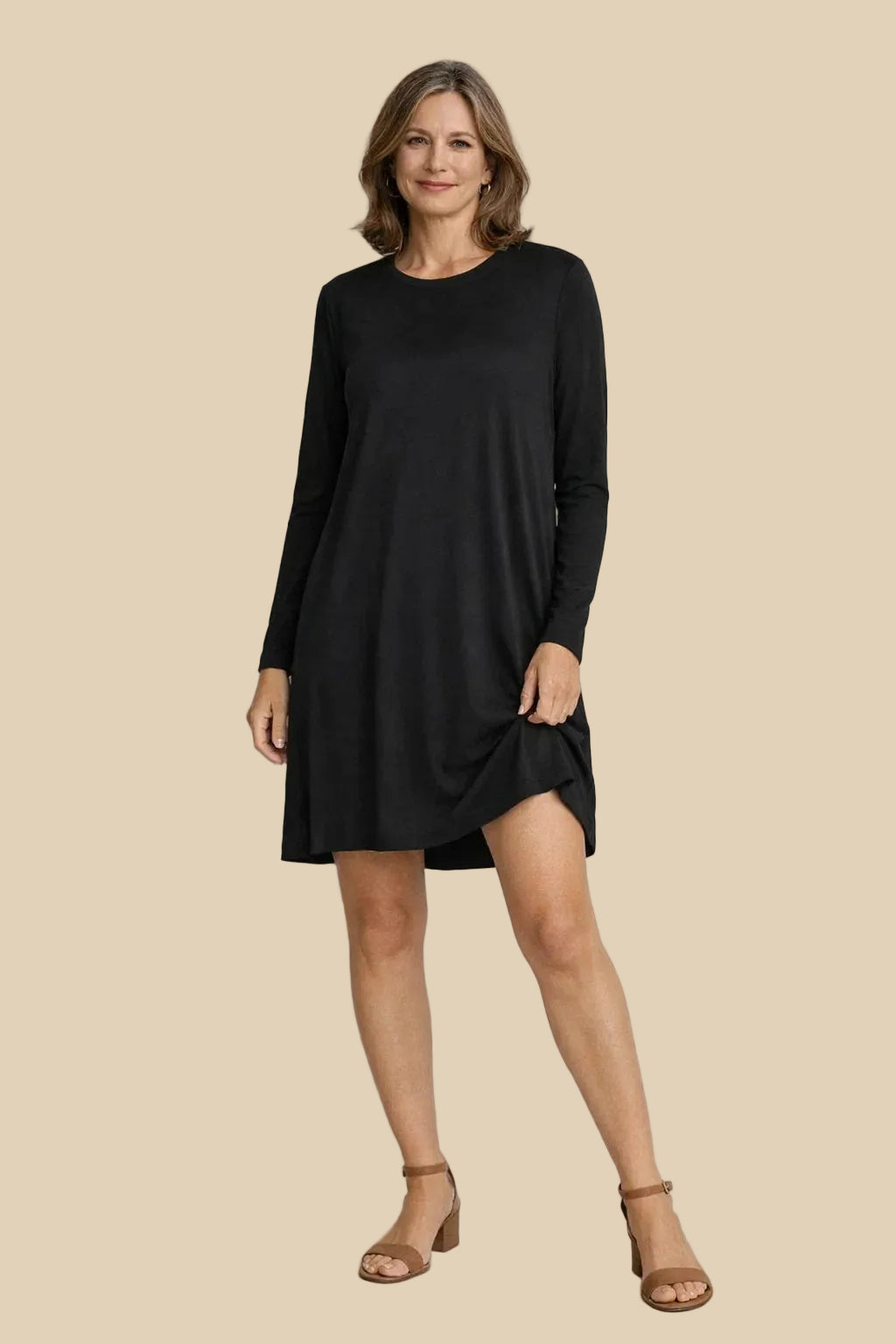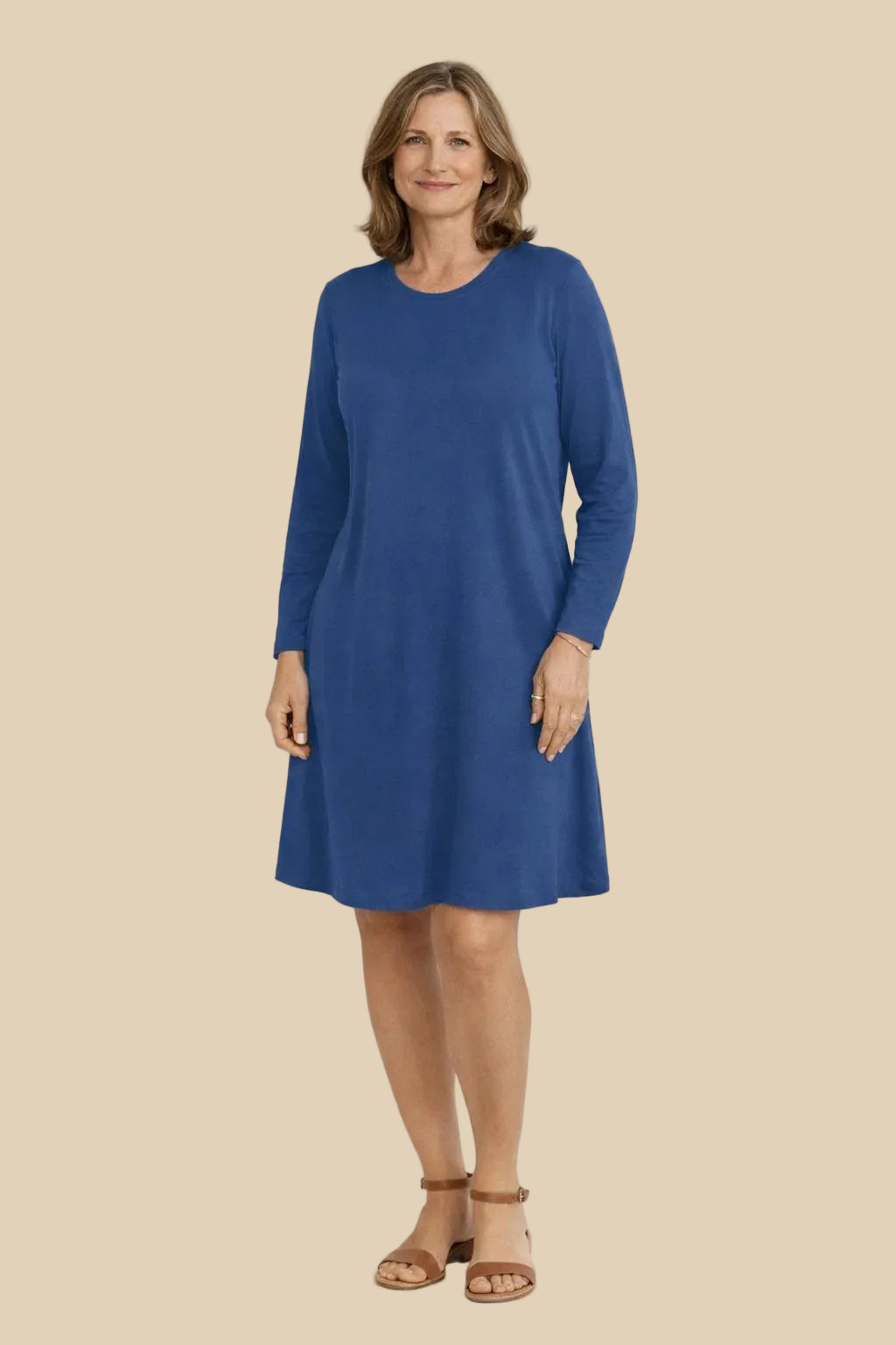 Je nach Schnitt fällt das Kleid körpernah oder fließend. Für einen engeren Sitz empfehlen wir eine Größe kleiner.